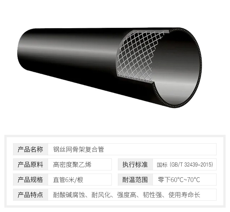 鋼絲網骨架聚乙烯復合管不但具有防腐、不結垢 、光滑低阻、保溫不結蠟、耐磨、質量輕等塑料管的共同特點,而且其獨特的結構還造就了如下特點: